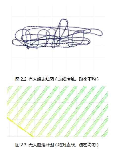 水下地形測量常用的方式是有人船搭載單波束測深儀進行數據的采集測量。而有人船的弊端也在應用中逐步顯現出來,如有人船難以走直線直接影響作業效率和數據質量(如圖2.2)、租船需要提前聯系、租好船需要安裝設備,均需要花費大量時間以及支付一定租船費用,當遇到淺水區域時,無法采用有人船測量等等。
