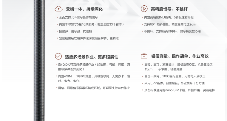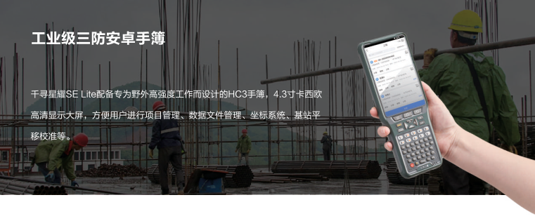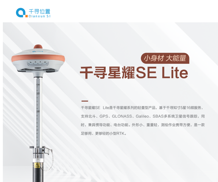 千尋星耀SE Lite是千尋星耀系列的輕量型產品,基于千尋知寸5星16頻服務,支持 北斗、GPS、GLONASS、Galileo、SBAS多系統衛星信號跟蹤,同時,具有慣導功能、電臺功能。外形小、重量輕,測繪作業攜帶方便,是一款夠用、夠輕的小型RTK。